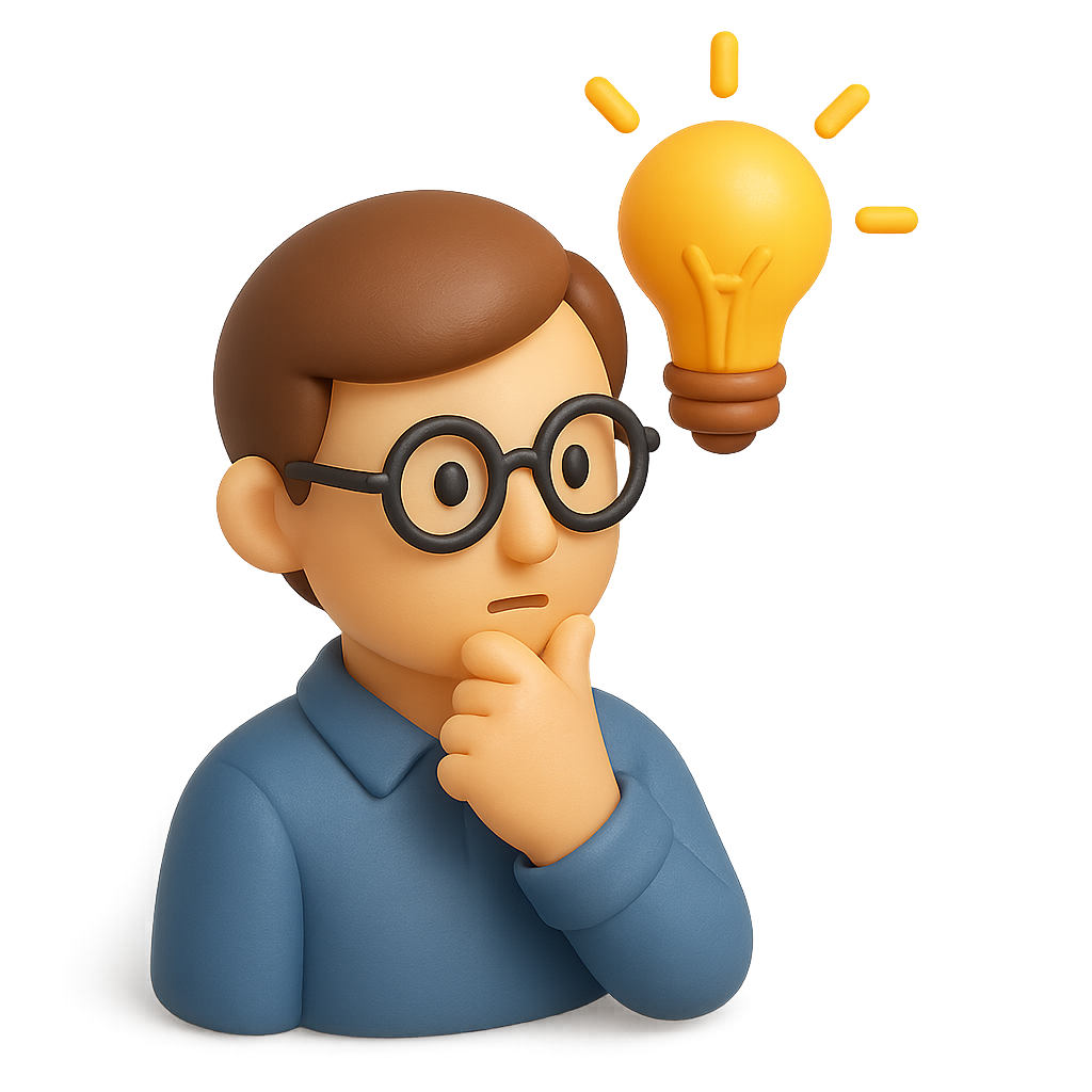 A 3D icon depicting an intellectual character with glasses, pondering ideas. A light bulb hovers above, symbolizing creativity and inspiration.