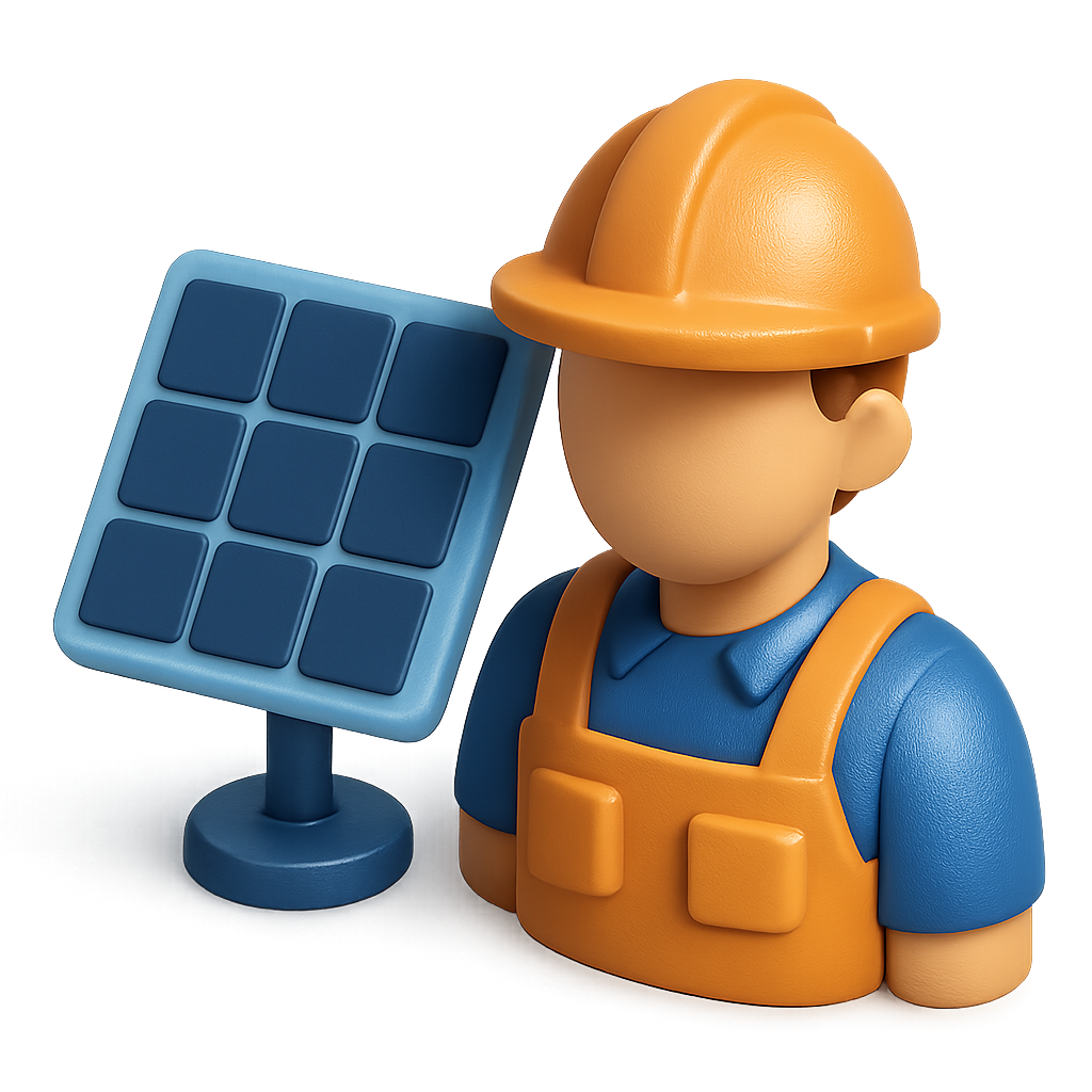 /Collection: /by davooda/Type: PNG/A stylized 3D icon featuring a solar panel and a worker in an orange hard hat and overalls. The design has a three-quarter view with a transparent background, emphasizing a modern volumetric aesthetic.