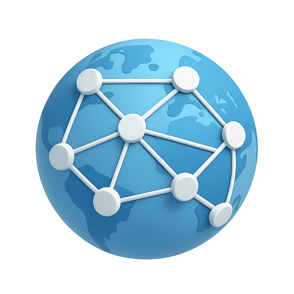/Collection: /by davooda/Type: PNG/A stylized 3D globe showcasing interconnected nodes, emphasizing a global network. The globe features a smooth surface with a light blue color and white lines connecting various nodes.
