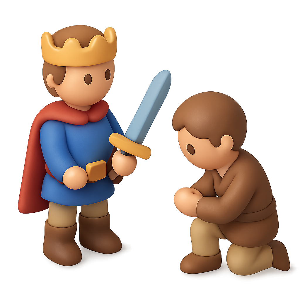 /Collection: /by davooda/Type: PNG/A colorful 3D icon depicting a feudal lord with a crown and sword, interacting with a kneeling vassal. The design features a transparent background and a volumetric, isometric style.