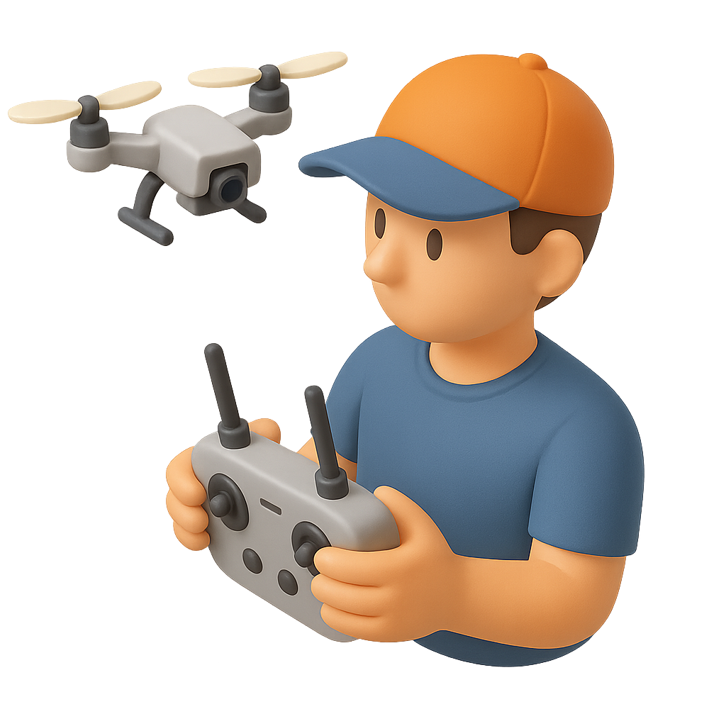 A 3D icon depicting a drone pilot holding a controller, featuring a three-quarter view. The pilot wears a cap and a t-shirt, with a drone hovering above.