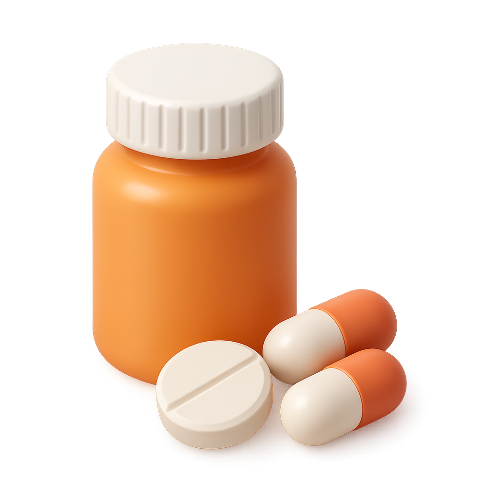 /Collection: /by davooda/Type: PNG/A visually appealing 3D icon featuring an orange pill bottle accompanied by two capsules and a tablet. The design is isometric with a transparent background, emphasizing its volumetric quality.