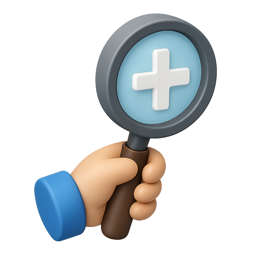 A stylized 3D icon depicting a hand holding a magnifying glass. The glass features a blue background with a white plus sign, set against a dark backdrop to enhance depth.