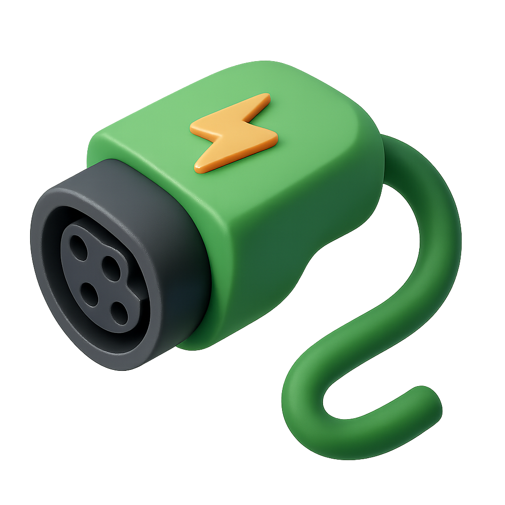 A vibrant 3D icon of an electric car charging connector, featuring a green body with a lightning bolt symbol. The design showcases a three-quarter isometric view with a volumetric feel.