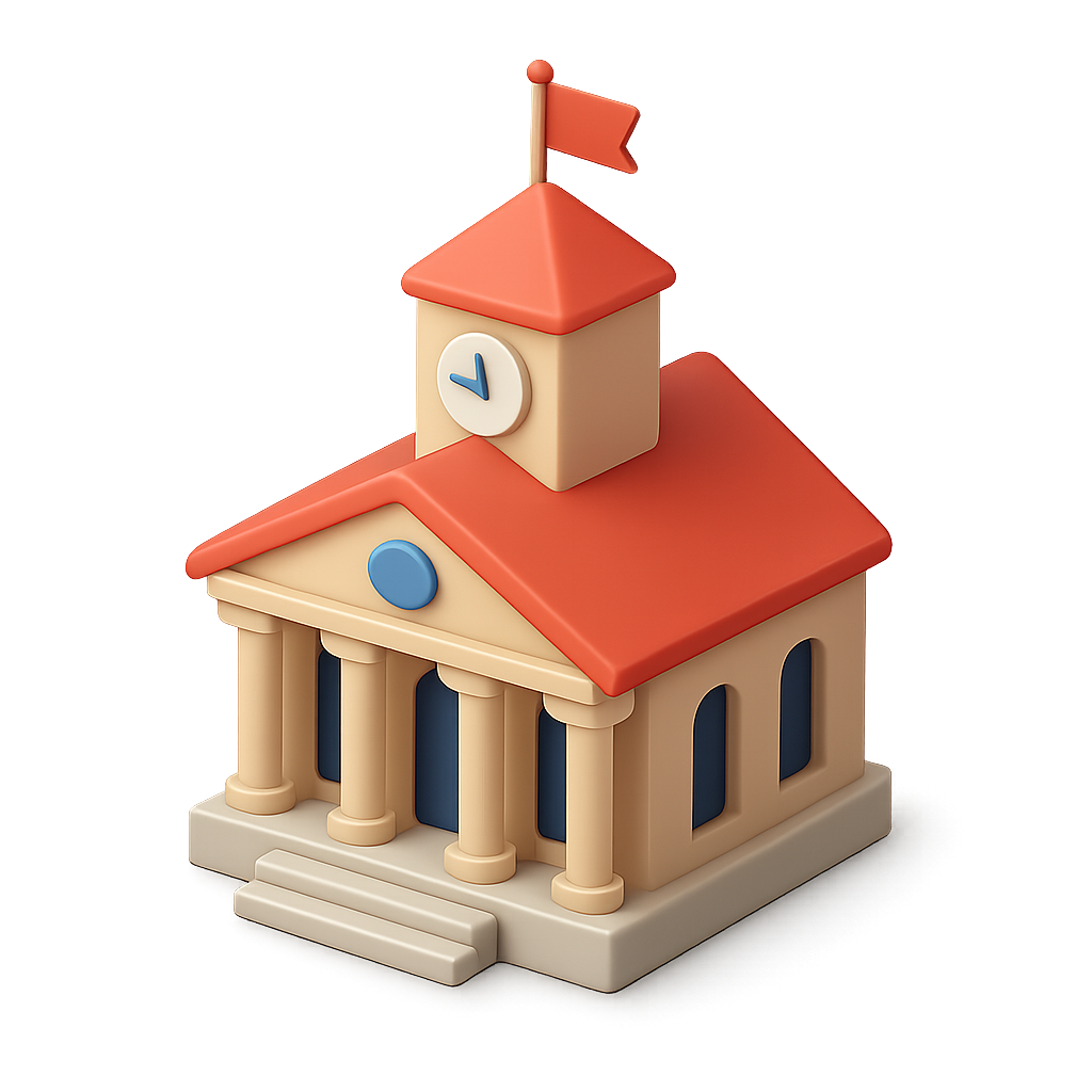 A charming 3D representation of a town hall civic center featuring a red roof, flag, clock, and classical columns, set against a subtle gradient background.