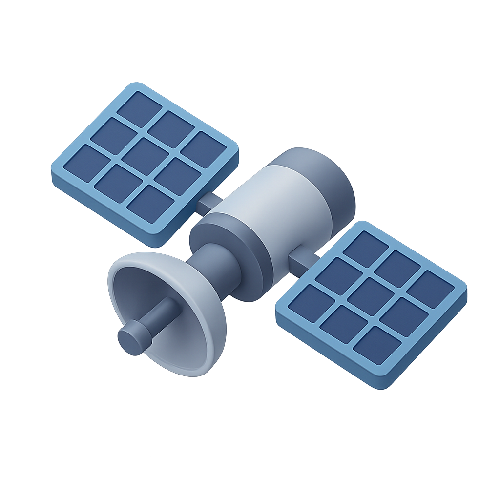A visually appealing 3D satellite icon featuring two solar panels and a cylindrical body. The design showcases a three-quarter view with a transparent background, emphasizing its isometric and volumetric qualities.