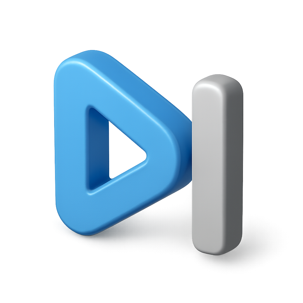 A modern 3D play button icon featuring a blue triangular shape and a vertical gray line, set against a subtle gradient background. The design emphasizes depth and volumetric style.
