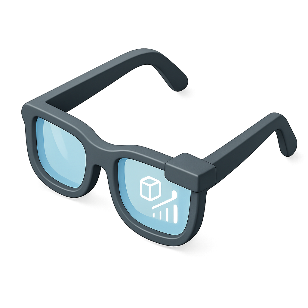 /Collection: /by davooda/Type: PNG/This image features a 3D icon of augmented reality glasses, designed with a sleek black frame and transparent lenses. The glasses are shown in a three-quarter view, giving them a volumetric and isometric appearance.
