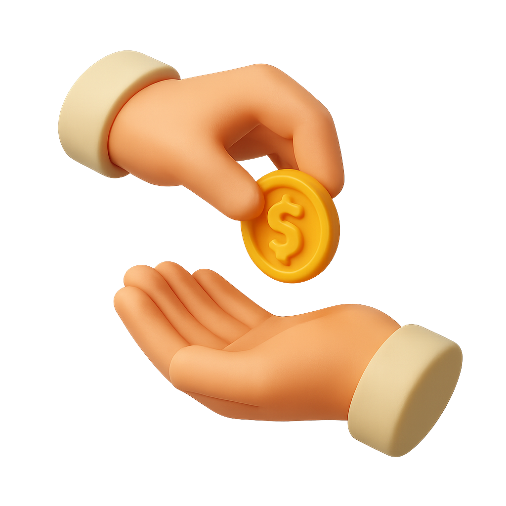 A 3D illustration depicting one hand giving a golden coin to another hand. The design features a volumetric and isometric style with a transparent background.