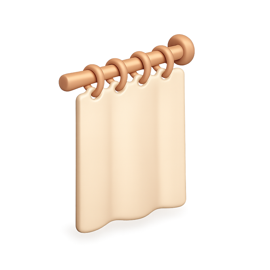 A simplistic 3D icon of a shower curtain with rings, featuring a transparent background and a three-quarter view. The design emphasizes a volumetric and isometric style.