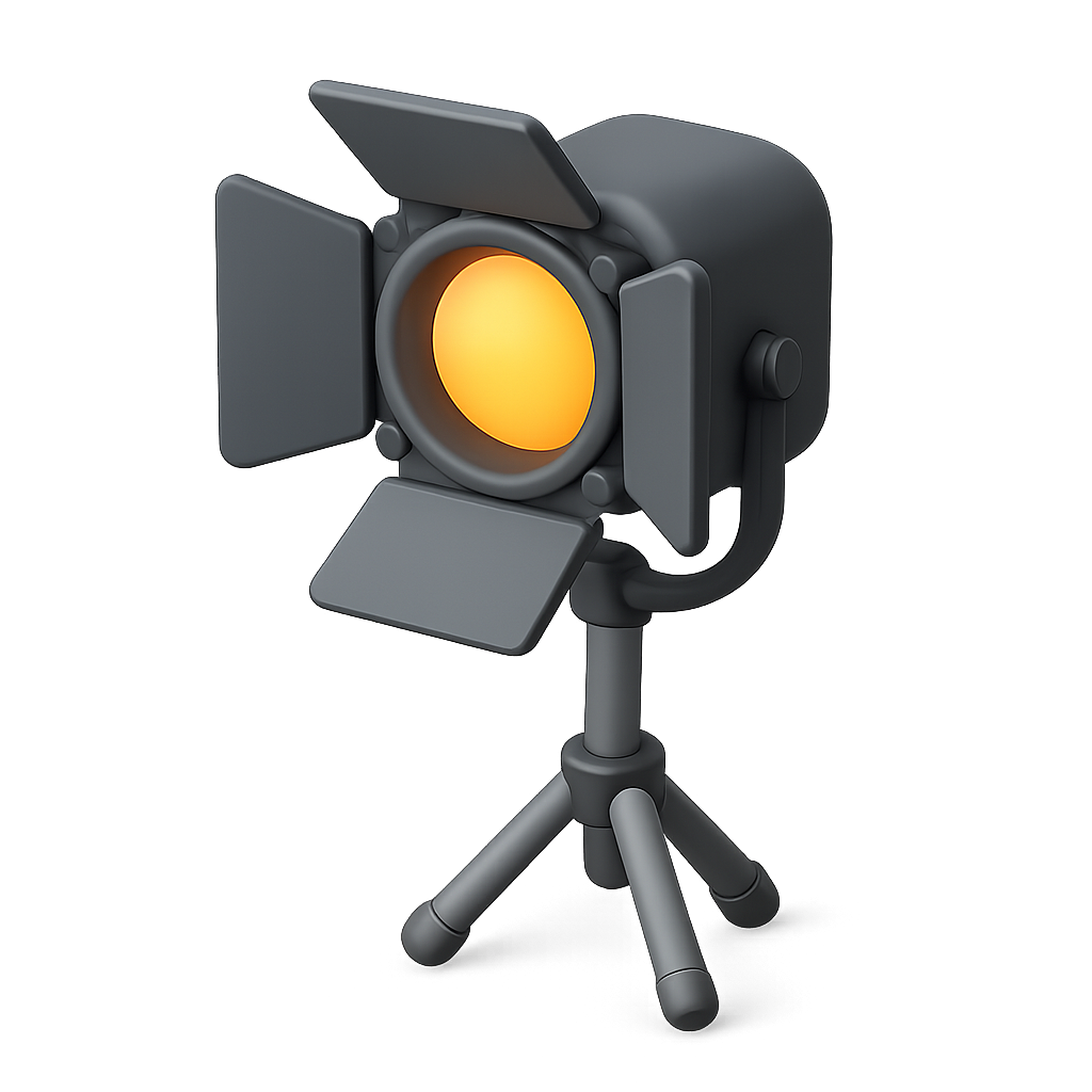 /Collection: /by davooda/Type: PNG/This image features a 3D icon of a lighting director's equipment, showcasing a spotlight with barn doors, designed in a sleek isometric view with a transparent background.
