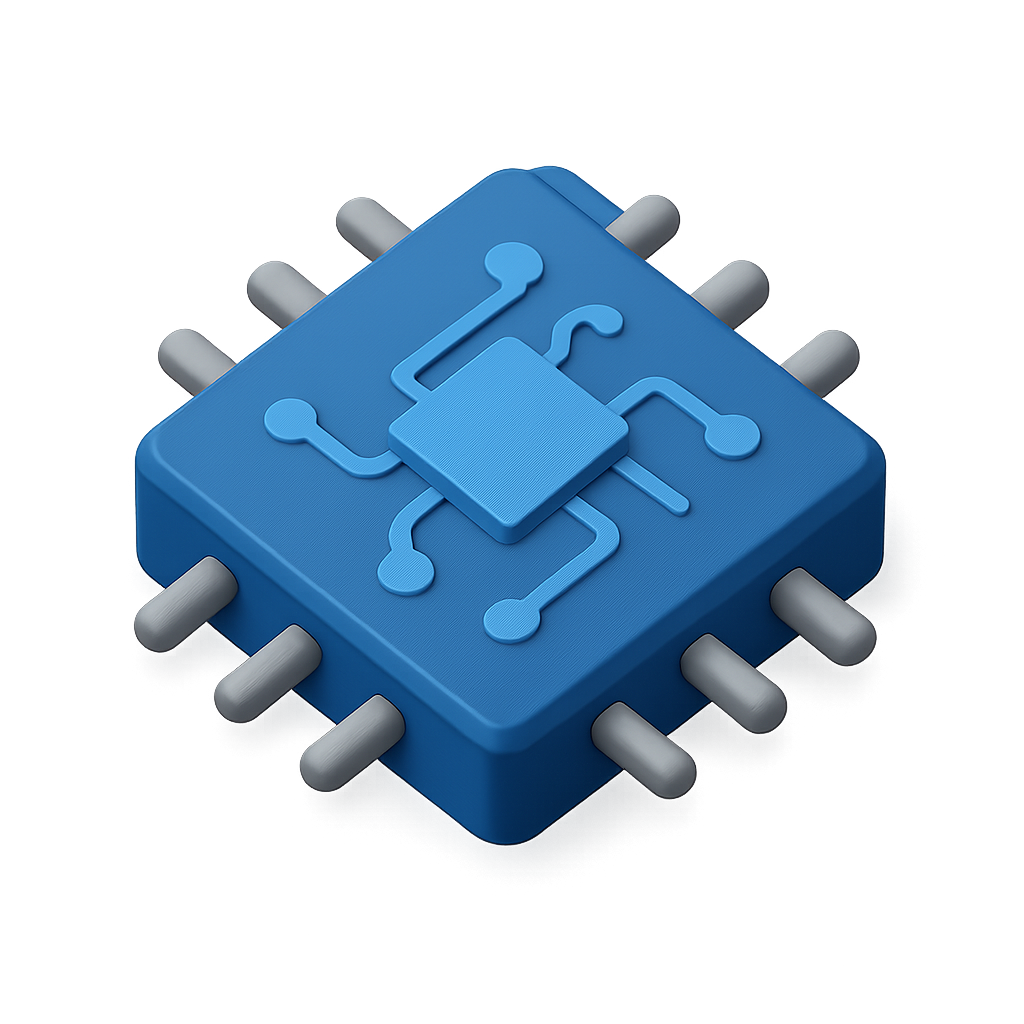This image features a stylized 3D microchip icon in a three-quarter view. The chip is blue with connected lines and gray pins, presented on a subtle gradient background, enhancing its volumetric appearance.