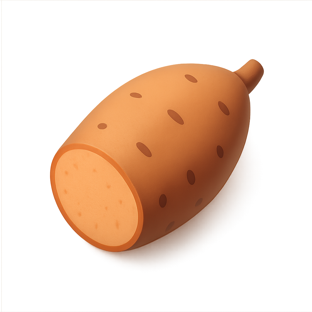 A visually appealing 3D representation of a yam, showcasing a three-quarter view with a smooth, volumetric texture. The yam features a light brown color with darker speckles, set against a transparent background.
