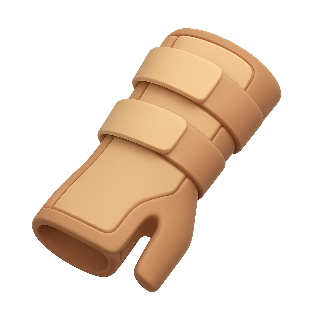 A stylized 3D wrist splint icon presented in a three-quarter view. The design features a soft, volumetric appearance with a neutral color palette and a transparent background.