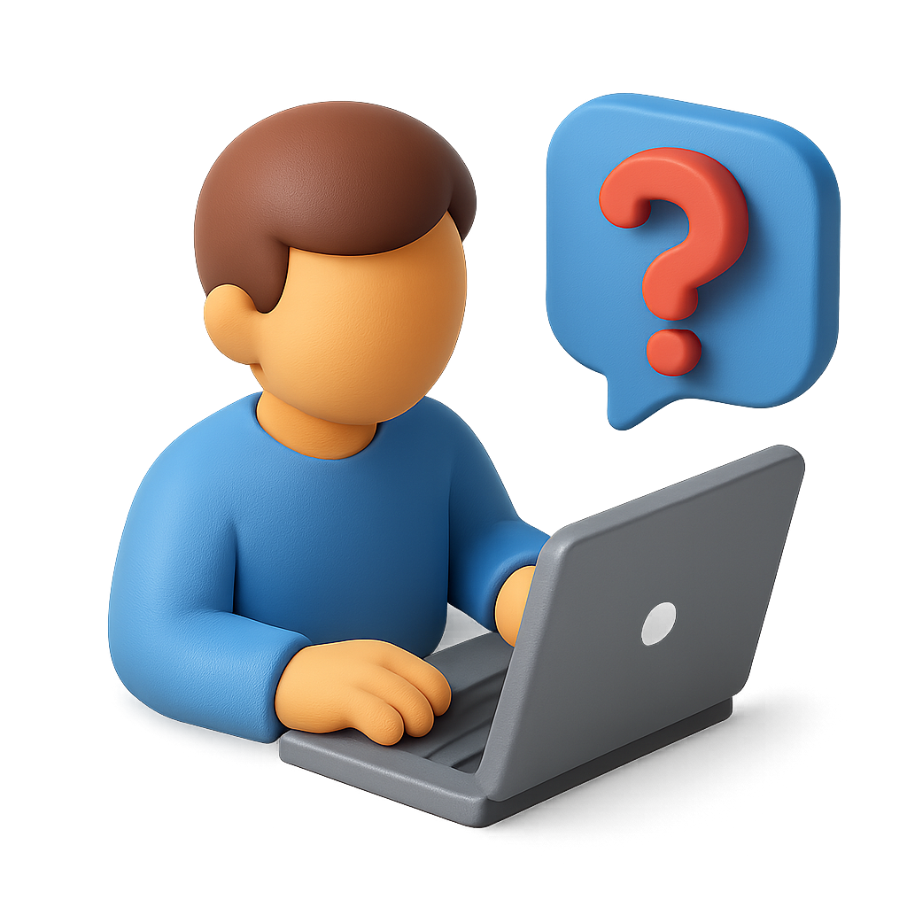 /Collection: /by davooda/Type: PNG/A 3D icon depicting a person seated at a laptop, engaging with a question mark symbol. The design features a three-quarter view, emphasizing a modern, isometric style with a volumetric feel.