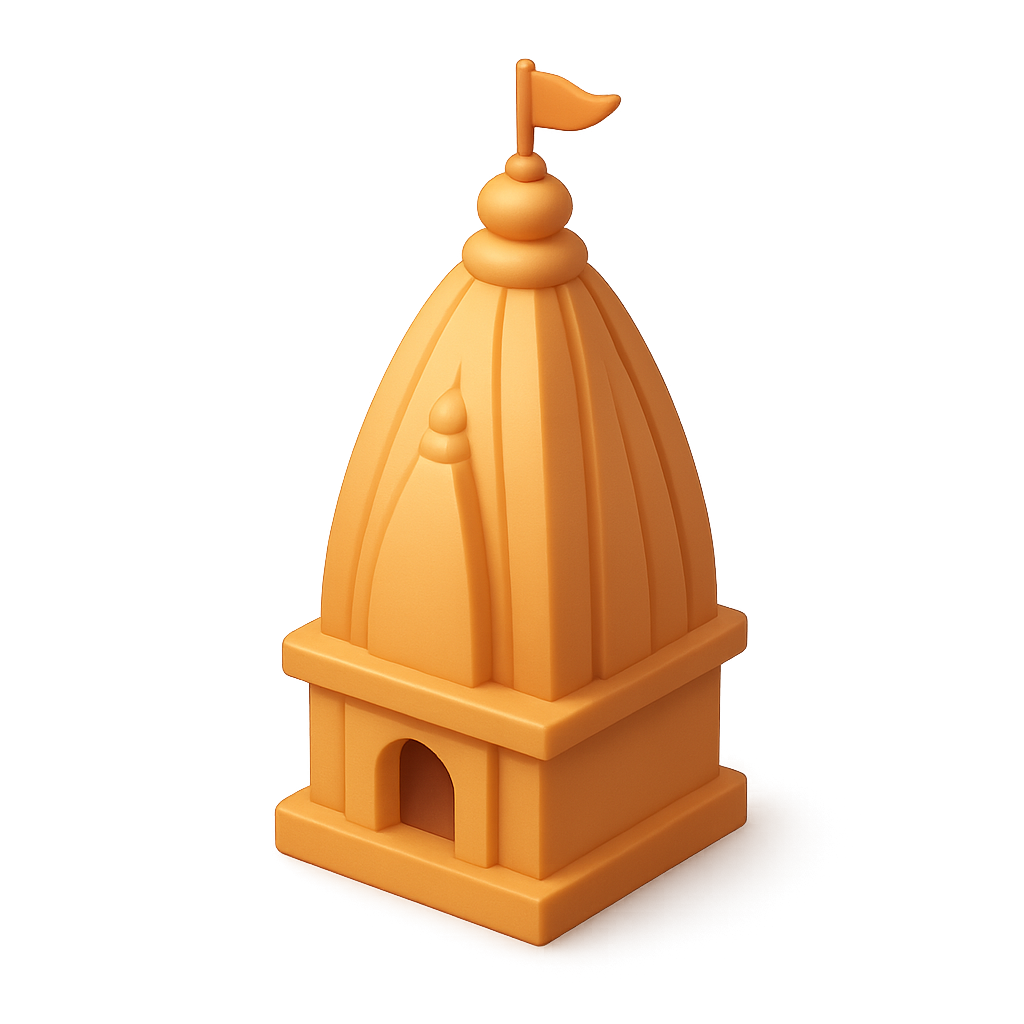 A stylized 3D representation of a Hindu temple shikhara, featuring a smooth, volumetric design in an isometric view. The temple is adorned with a flag and has a transparent background.