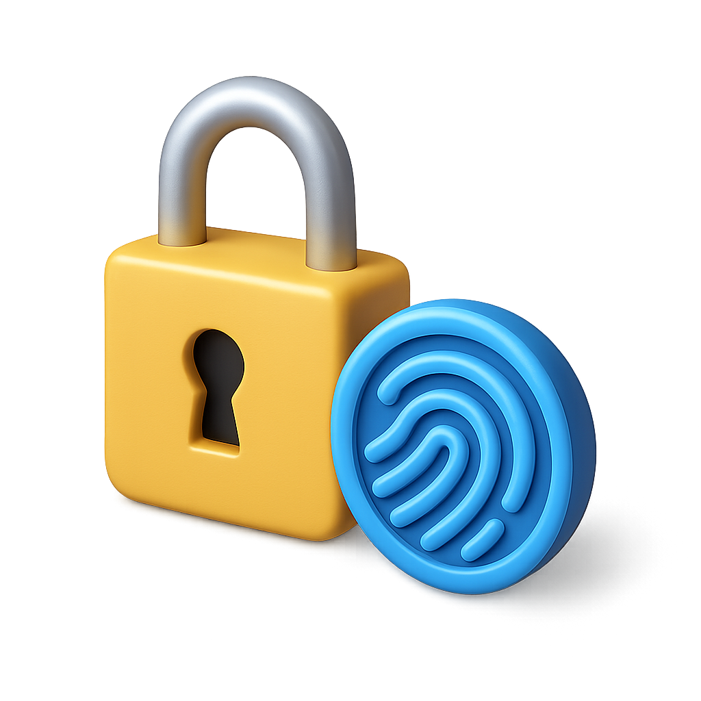 /Collection: /by davooda/Type: PNG/This image features a 3D lock icon alongside a stylized fingerprint, both designed with a vibrant color palette. The lock is yellow with a metallic silver shackle, while the fingerprint is blue, showcasing a modern isometric style.