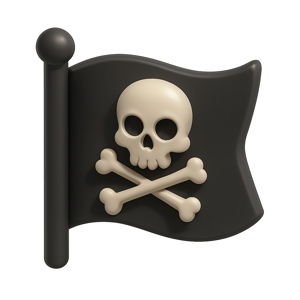 A stylized 3D icon of a pirate skull on a black flag, featuring a transparent background and a three-quarter view. The design includes crossbones, emphasizing a playful yet bold aesthetic.