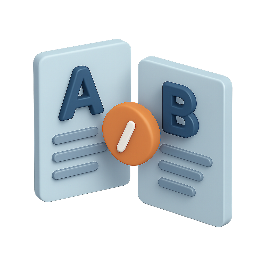 A visually striking 3D icon representing A/B testing, featuring two cards labeled 'A' and 'B' with an orange button in the center, set against a transparent background.