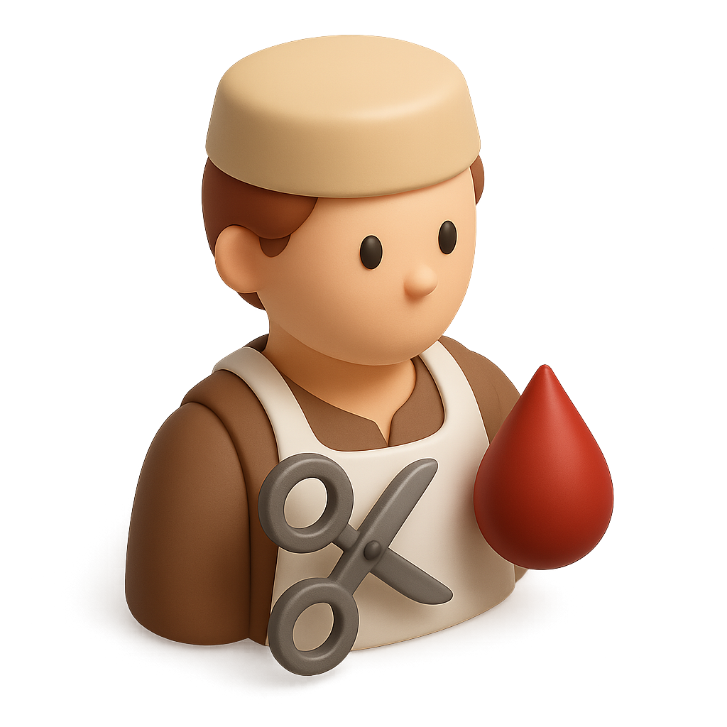 /Collection: /by davooda/Type: PNG/This 3D icon features a barber surgeon character holding scissors and a red blood drop. The character has a stylized, friendly appearance with a beige cap and a brown outfit.