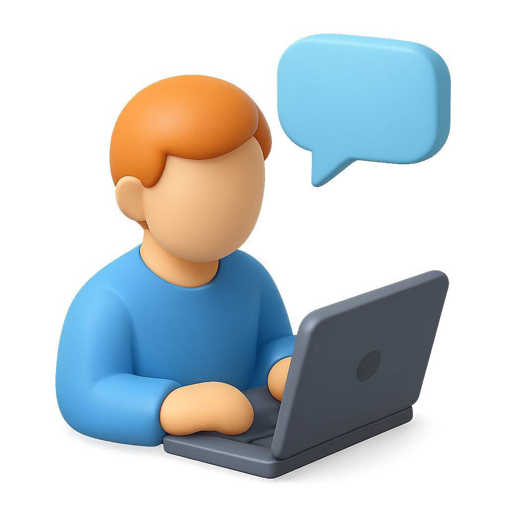 A stylized 3D icon depicting a person using a laptop, accompanied by a speech bubble. The design features a transparent background and a three-quarter view, emphasizing a modern and isometric aesthetic.