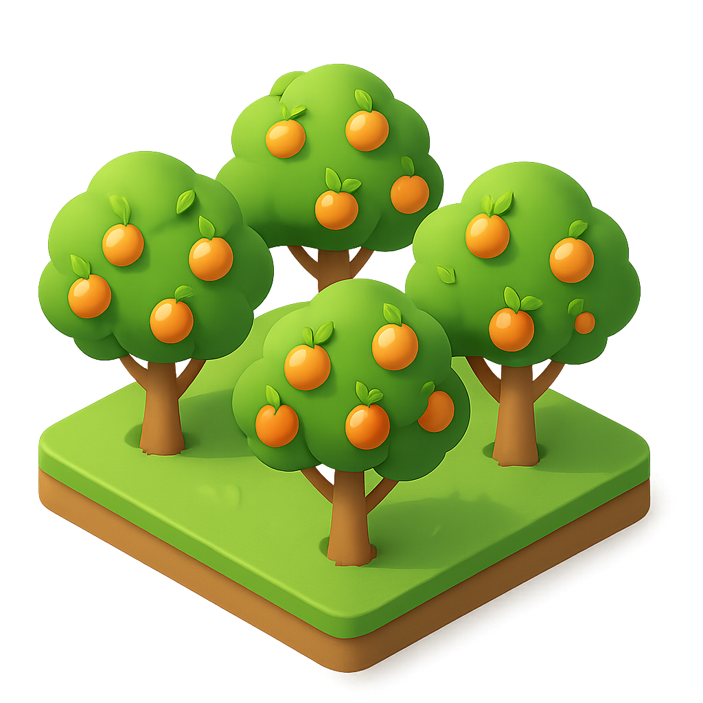 A stylized 3D icon depicting a vibrant orange grove with three trees, each bearing ripe oranges. The design features a transparent background, showcasing a playful and isometric view.