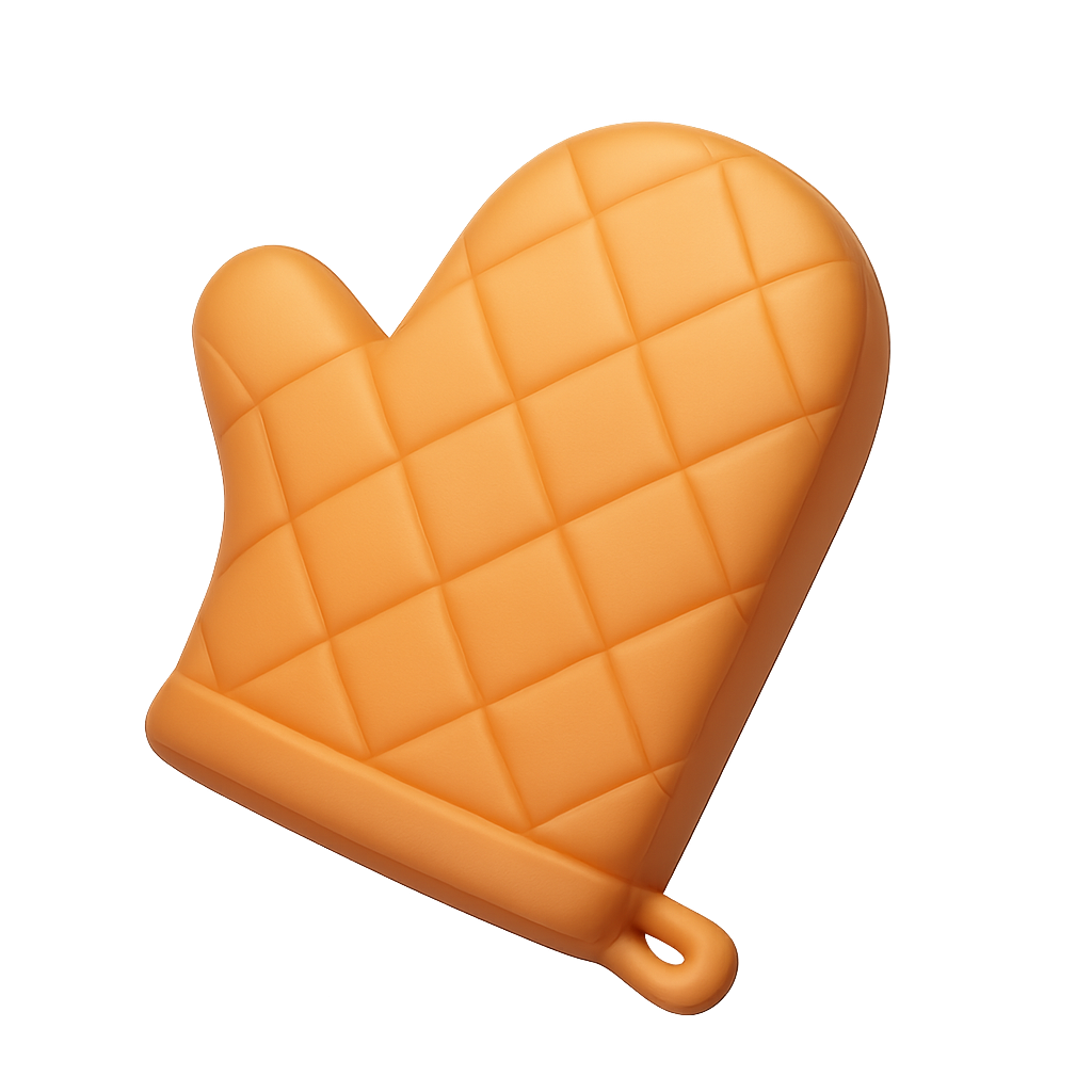 A stylized 3D icon of an oven mitt featuring a quilted pattern and a smooth, volumetric appearance against a subtle gradient background.
