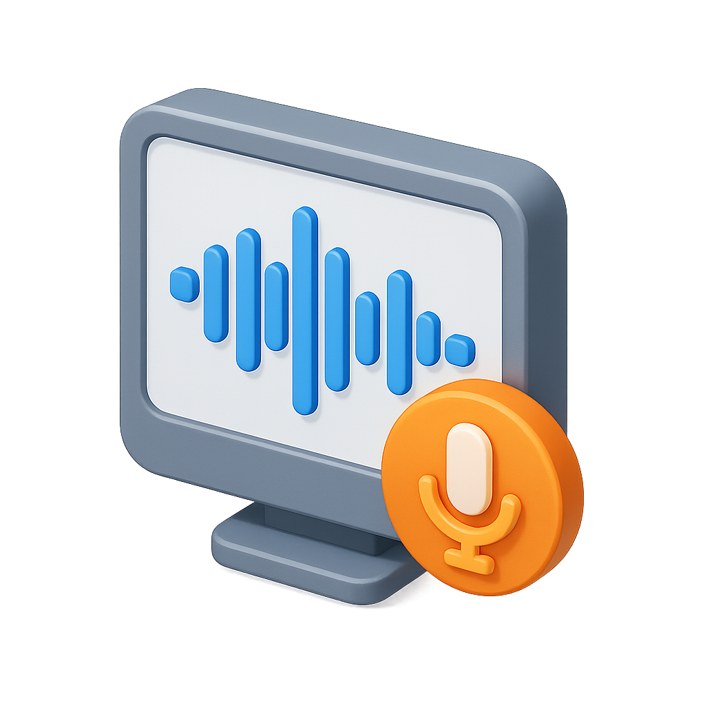 A 3D icon featuring a computer monitor displaying sound waves, alongside a microphone symbol. The design is isometric with a transparent background, emphasizing a modern audio analysis theme.
