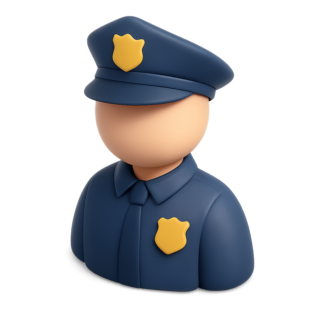/Collection: /by davooda/Type: PNG/A three-dimensional, stylized icon of a police officer wearing a blue uniform and a badge. The design features a transparent background and a three-quarter view that emphasizes its volumetric and isometric qualities.