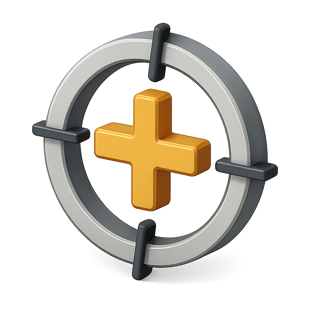 A visually appealing 3D crosshair target icon featuring a glossy orange plus sign at the center, framed by a metallic circular outline, designed for a modern look.
