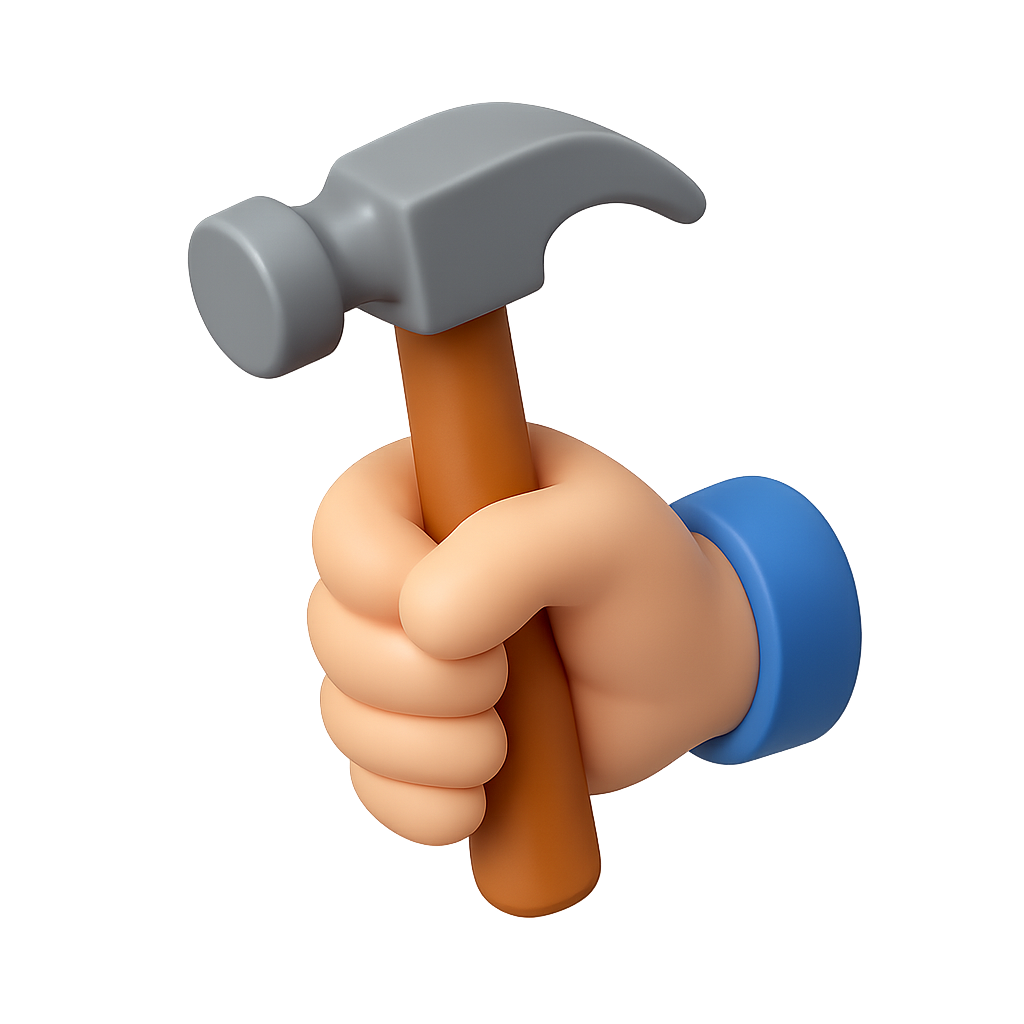 /Collection: /by davooda/Type: PNG/A visually appealing 3D icon of a hand holding a hammer, featuring a transparent background. The design has a three-quarter view with a volumetric feel, emphasizing the hammer's shape and details.