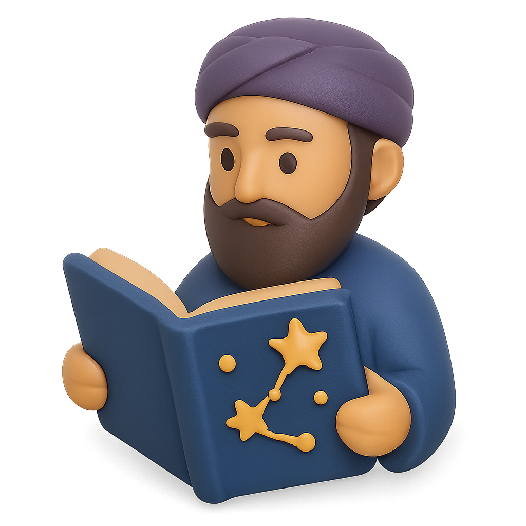 A 3D icon of an astrologer reading a book with star symbols, designed in a volumetric isometric style. The figure has a beard and wears a turban, set against a soft gradient background.