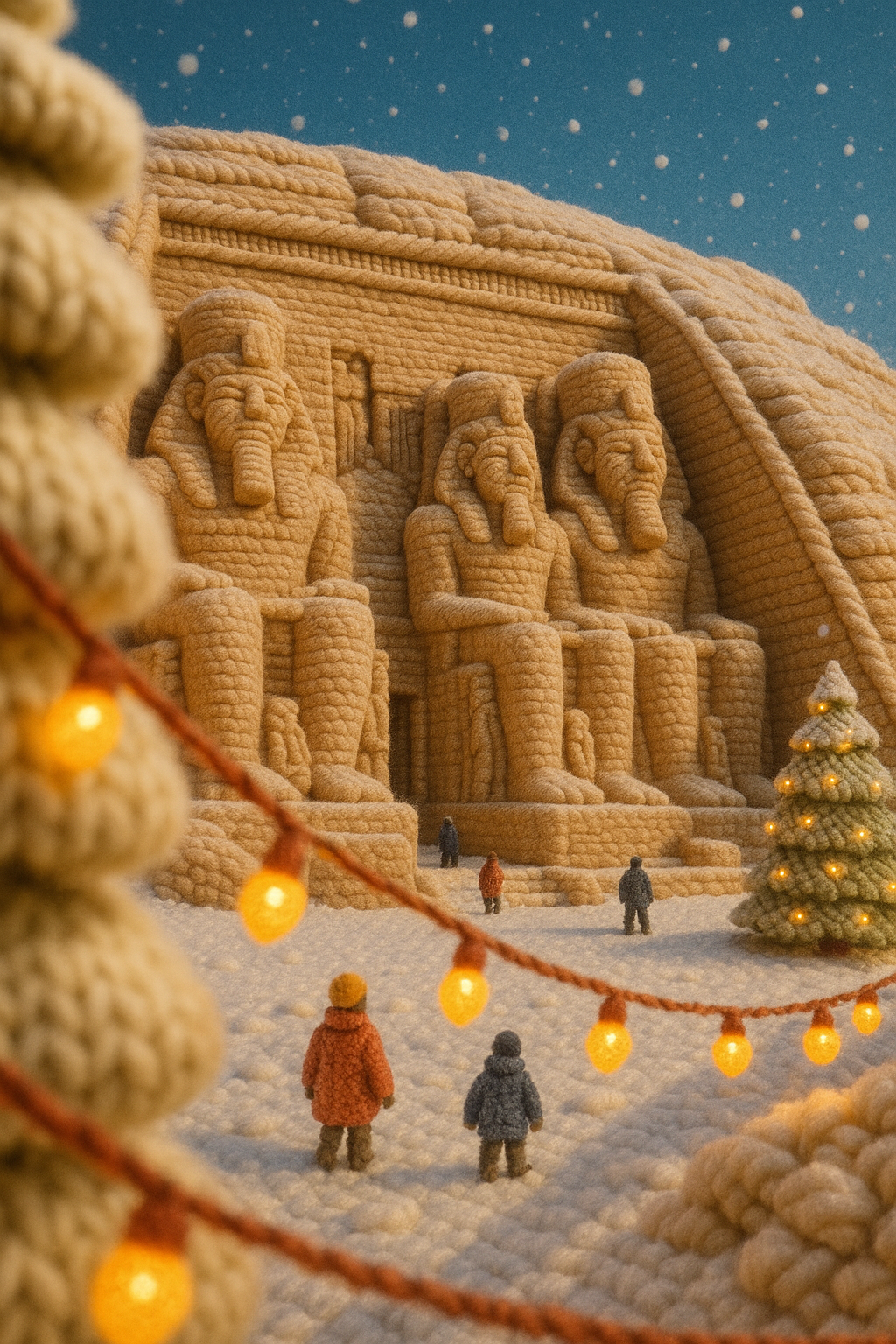 A whimsical 3D representation of Abu Simbel, crafted from thick yarn-like textures. The scene features a snowy atmosphere with small figures, glowing lights, and a beautiful contrast with a solid blue sky.