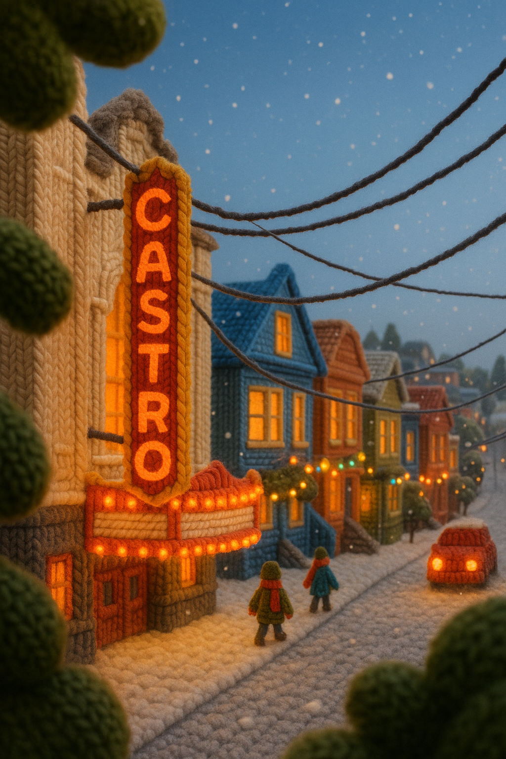 /Collection: /by davooda/Type: PNG/A charming 3D winter scene depicting the Castro District in San Francisco, crafted with yarn-like textures. The setting features cozy, colorful buildings adorned with festive lights, light snowfall, and small figures enjoying the holiday ambiance.