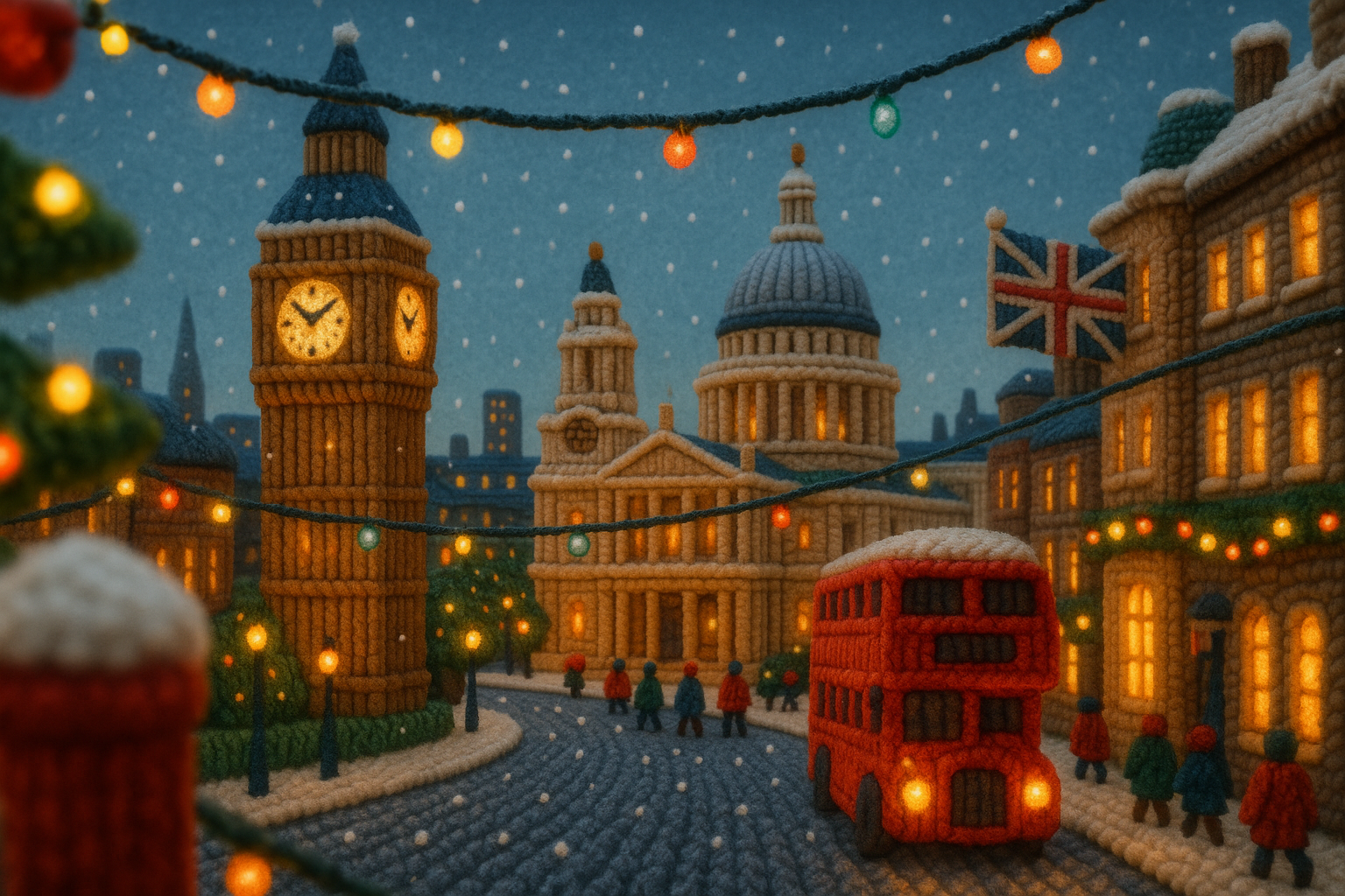 /Collection: /by davooda/Type: PNG/A cozy, textured winter scene depicting downtown London, featuring iconic landmarks crafted from thick wool-like strands. Soft snowfall and festive lights create a warm holiday atmosphere.