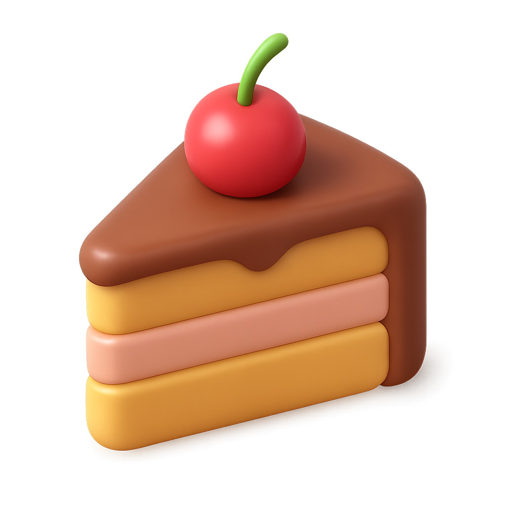 A visually appealing 3D icon of a slice of cake featuring layers of yellow, pink, and brown topped with a red cherry, set against a soft gradient background.