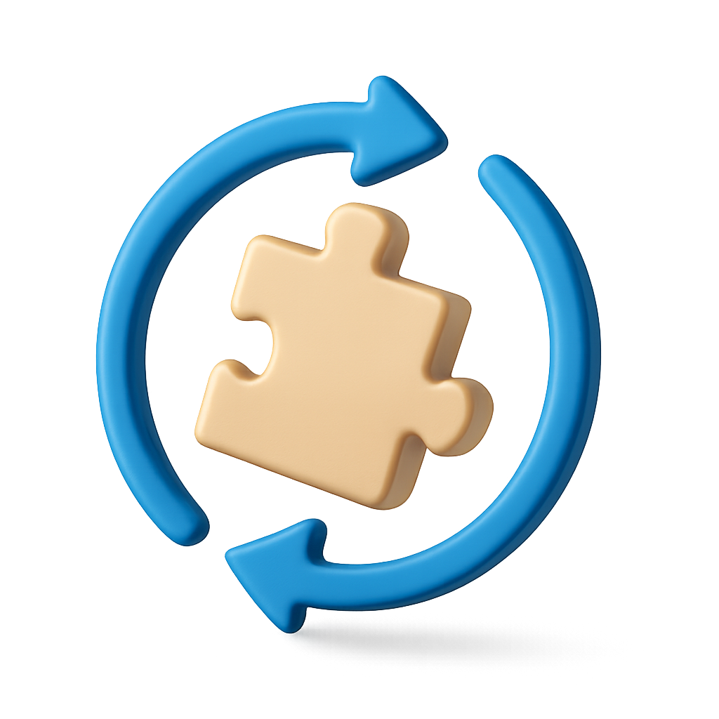 The image features a beige puzzle piece at the center, surrounded by blue arrows forming a circular flow. The design has a three-dimensional effect, enhancing its volumetric appearance.