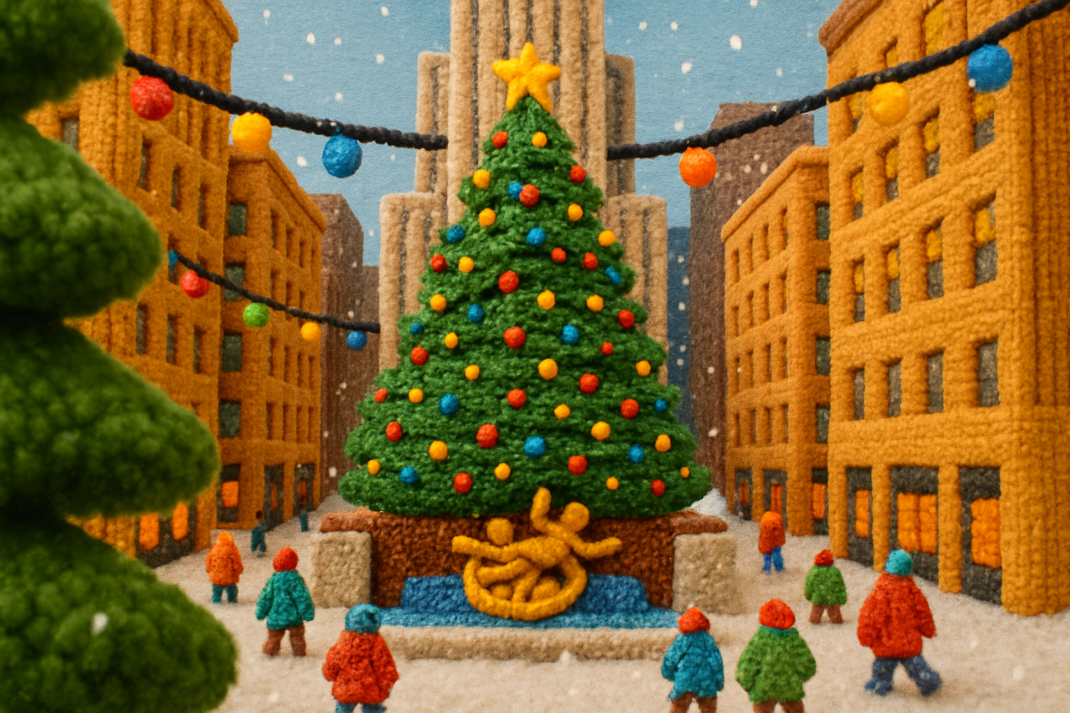 Whimsical Rockefeller Center Scene in 3D Yarn Art