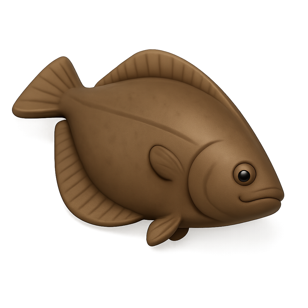 A stylized 3D icon of a halibut, showcasing its flat shape and smooth texture. The fish is rendered in a three-quarter view with a soft brown color against a muted background.