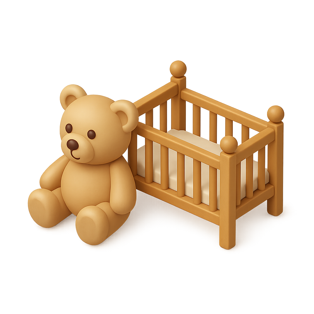 3D Teddy Bear Icon Beside a Crib in Isometric View