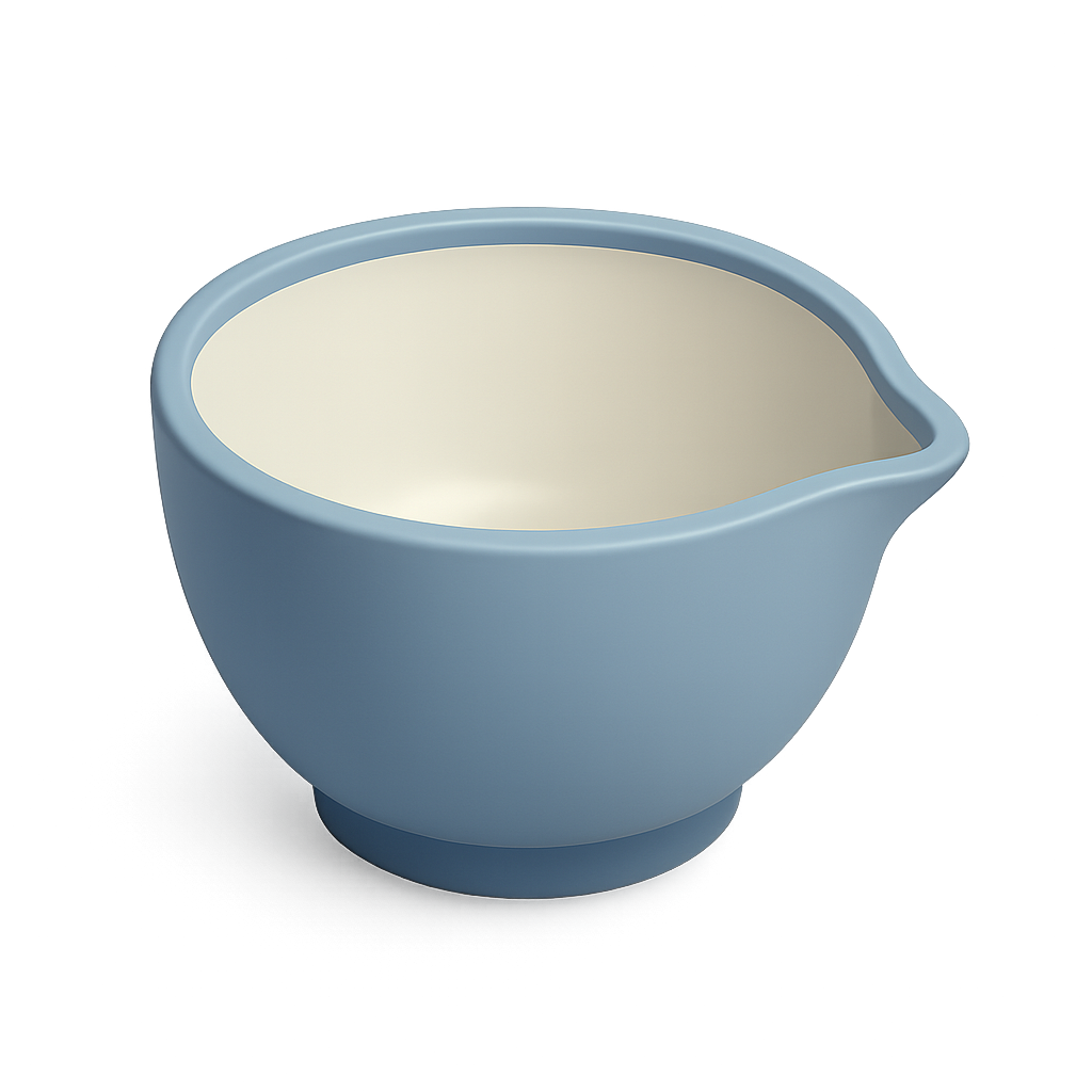 A visually appealing 3D rendering of a mixing bowl featuring a spout, shown from a three-quarter angle. The bowl is a soft blue with a smooth finish and a contrasting interior.