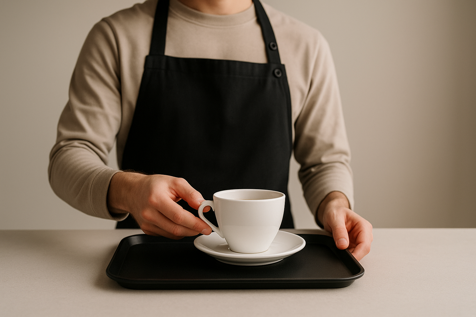 Barista Placing Cup on Stylish Tray in Minimalist Setting
