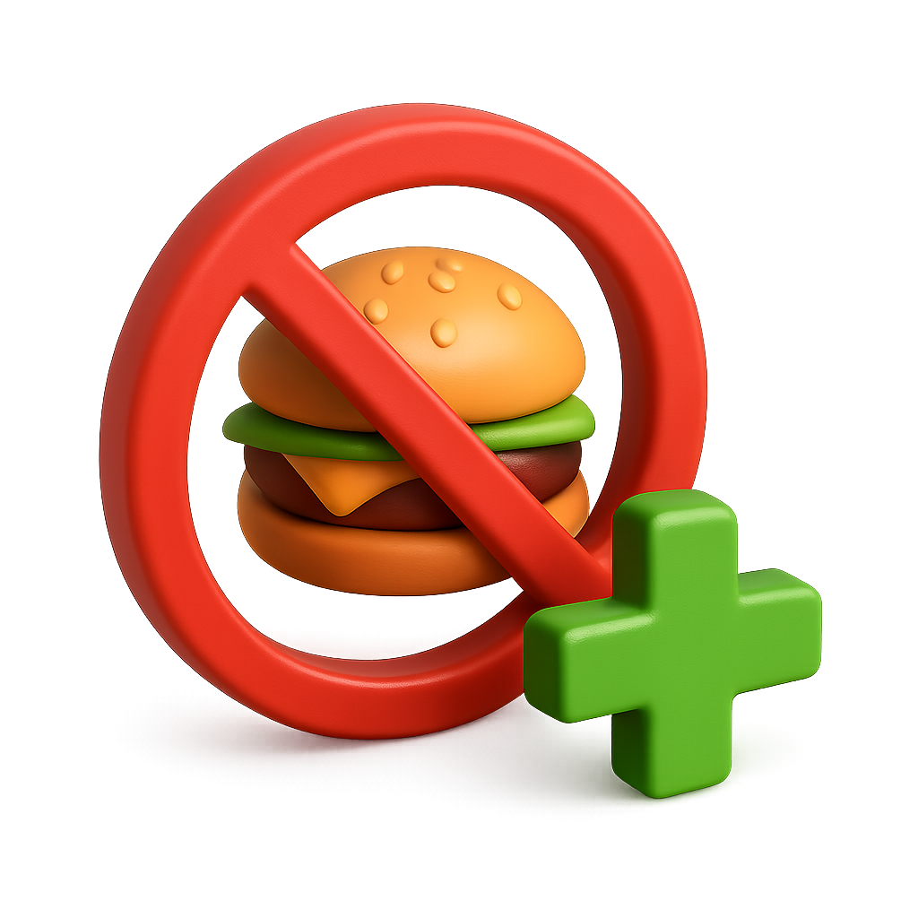 A vibrant 3D icon featuring a red prohibition symbol over a burger, accompanied by a green plus sign. The design is isometric with a transparent background.