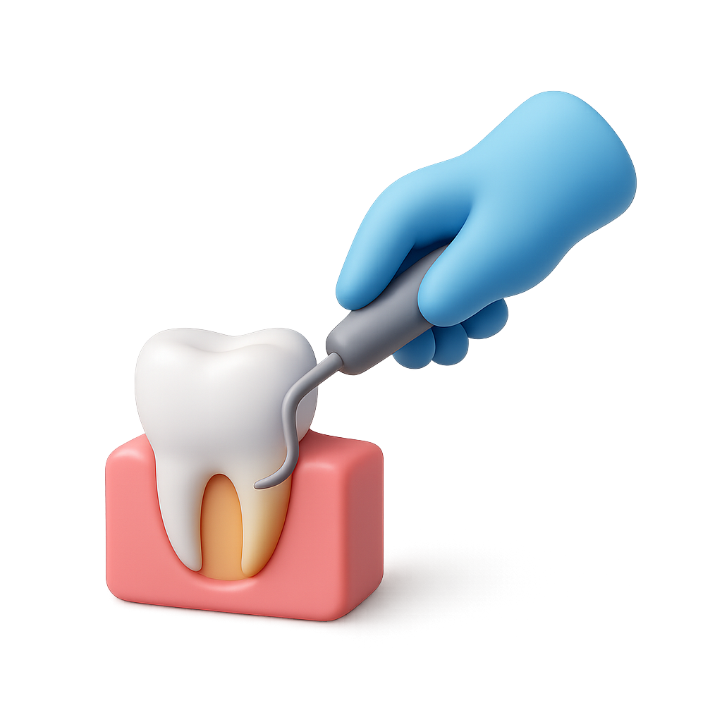 A 3D representation of a dental scaling and root planing scene featuring a hand holding a dental tool above a tooth model, set against a soft gradient background.