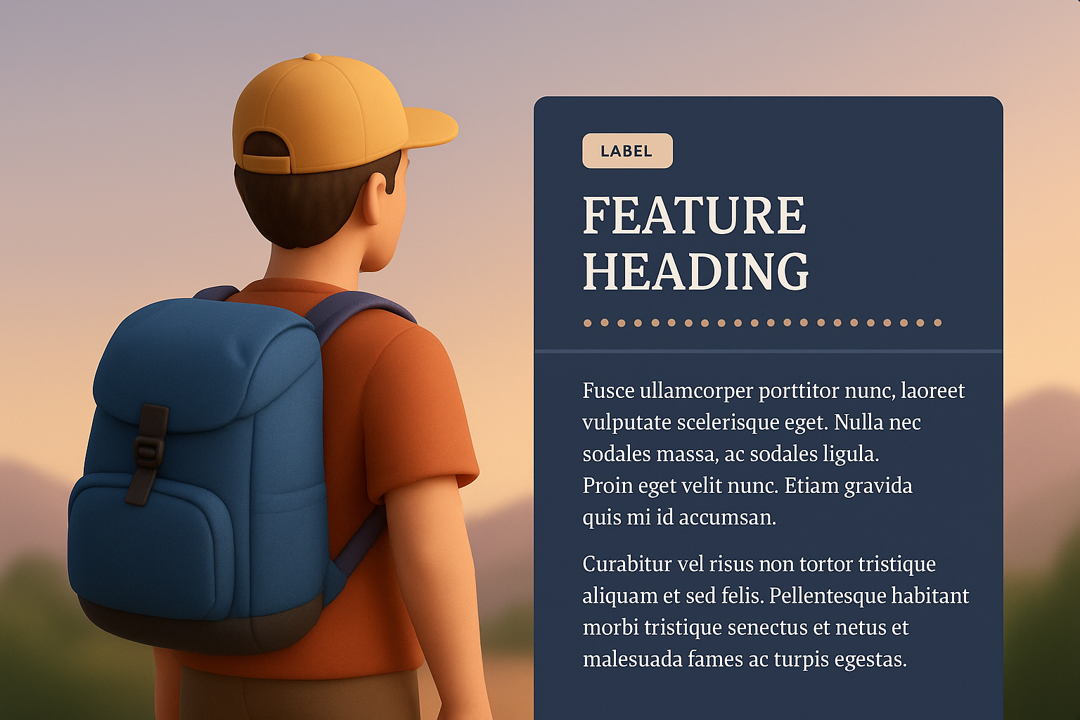 A 3D illustration featuring a tourist with a blue backpack in a serene mountainous environment. The design includes a gradient background and a feature block with a heading and text.