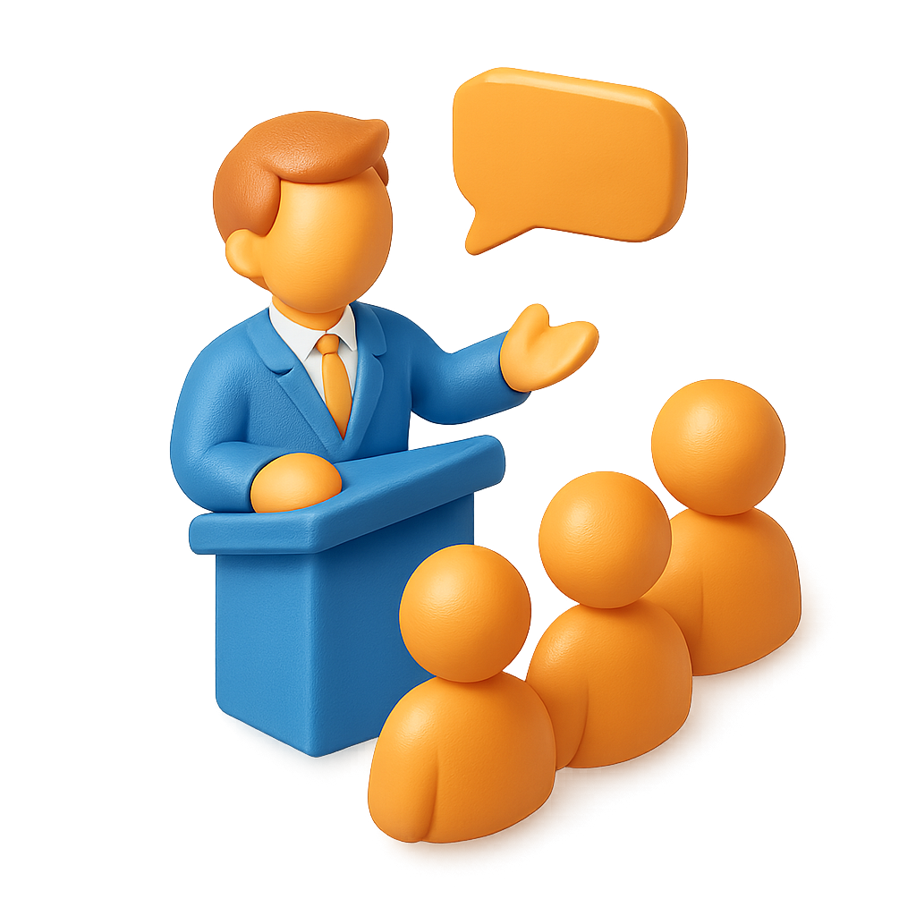 /Collection: /by davooda/Type: PNG/A vibrant 3D icon depicting a speaker in a suit addressing an audience. The speaker is gesturing with one hand, surrounded by simplified audience figures, all in an isometric style.