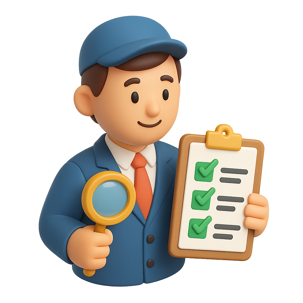 A colorful 3D icon depicting an appraiser in a blue suit holding a checklist. The character has a magnifying glass and displays a friendly expression, designed in an isometric view.