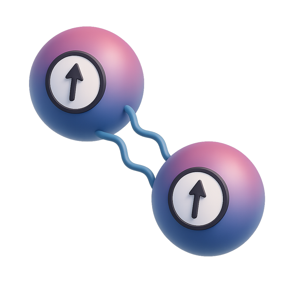 This image features a 3D representation of quantum entanglement, showcasing two interconnected spheres with upward arrows, set against a soft gradient background.