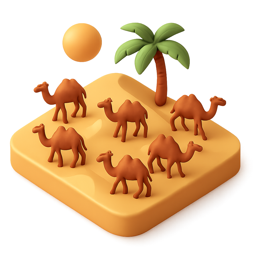 A vibrant 3D icon of a camel herd in a desert setting, featuring a palm tree and a sun. The design showcases a playful isometric style with a volumetric feel.