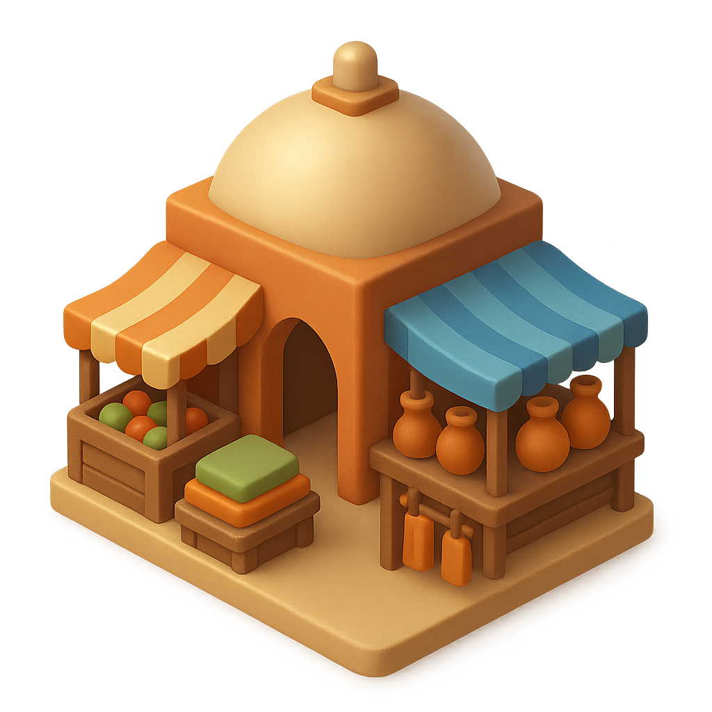 /Collection: /by davooda/Type: PNG/A colorful 3D icon representing a bazaar market with a domed structure and various stalls. Features vibrant awnings, stacked goods, and decorative pottery, all rendered in an isometric style.
